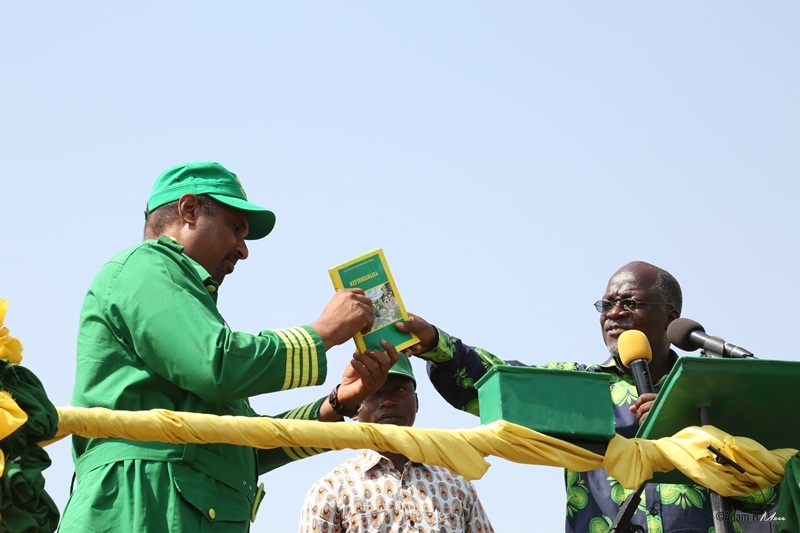 Mgombea wa urais kupitia CCM Dk. John Pombe Magufuli akitemkabidhi ilani ya uchaguzi ya CCM mgombea ubunge wa jimbo la Solwa Ndugu Ahmed Ally Salum (kushoto) kwenye mkutano wa kampeni uliofanyika viwanja vya Solwa Joshoni.